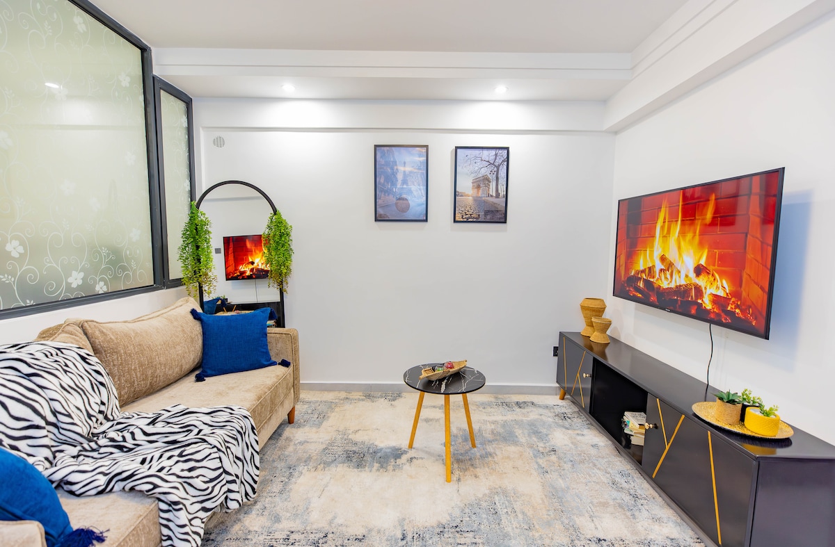 This entire stylish apartment is modern, spacious & comfortable, with one bedroom & en-suite bathroom, luxurious Queen size bed, eloquent dining room, bedroom & lounge Netflix-TV, balcony, kitchen and washing machine area. All amenities provided, including unlimited Fast WiFi and business facilities. Situated in a quiet leafy suburb, but also conveniently close to Westgate, Sarit and Lavington shopping malls, restaurants, business hubs, CBD and few meters walk away from Westlands nightlife.