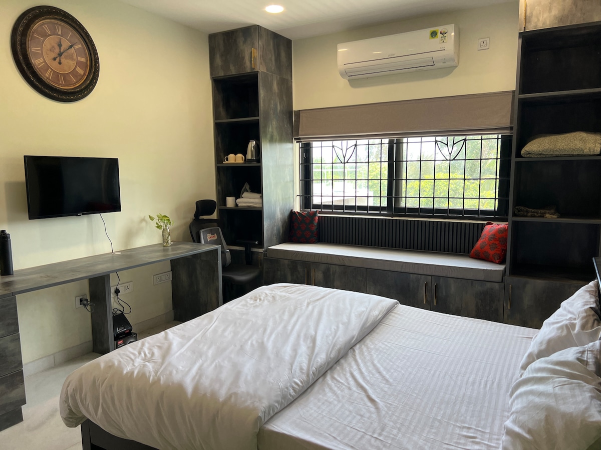 The house is located in a safe area and away from the hustle & bustle of the city and nestled in the sub urbs of the IT highway . It has ample windows and 2 balconies. It is very spacious and very calming . Lots of sunlight and great air flow. All necessary amenities are available including smart TV , fridge, washing machine, microwave oven, high speed wifi, CCTV etc. You will feel like its a home away from home.