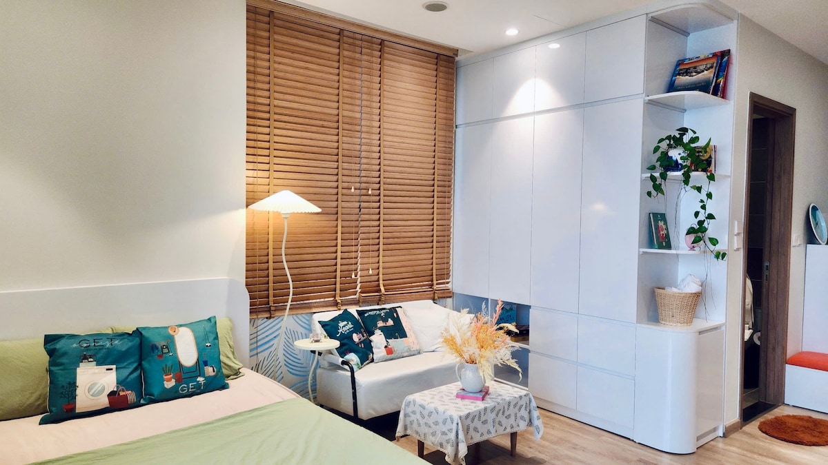 The apartment just opened in June 2025. It is meticulously designed in a mid-century style blended with Vietnamese cultural elements. Most importantly, it’s located right in Hoan Kiem District—just a 5-minute walk to the famous Train Street coffee check-in spot and another 5 minutes to Hanoi’s Old Quarter. Enjoy a stylish experience at this centrally-located place.