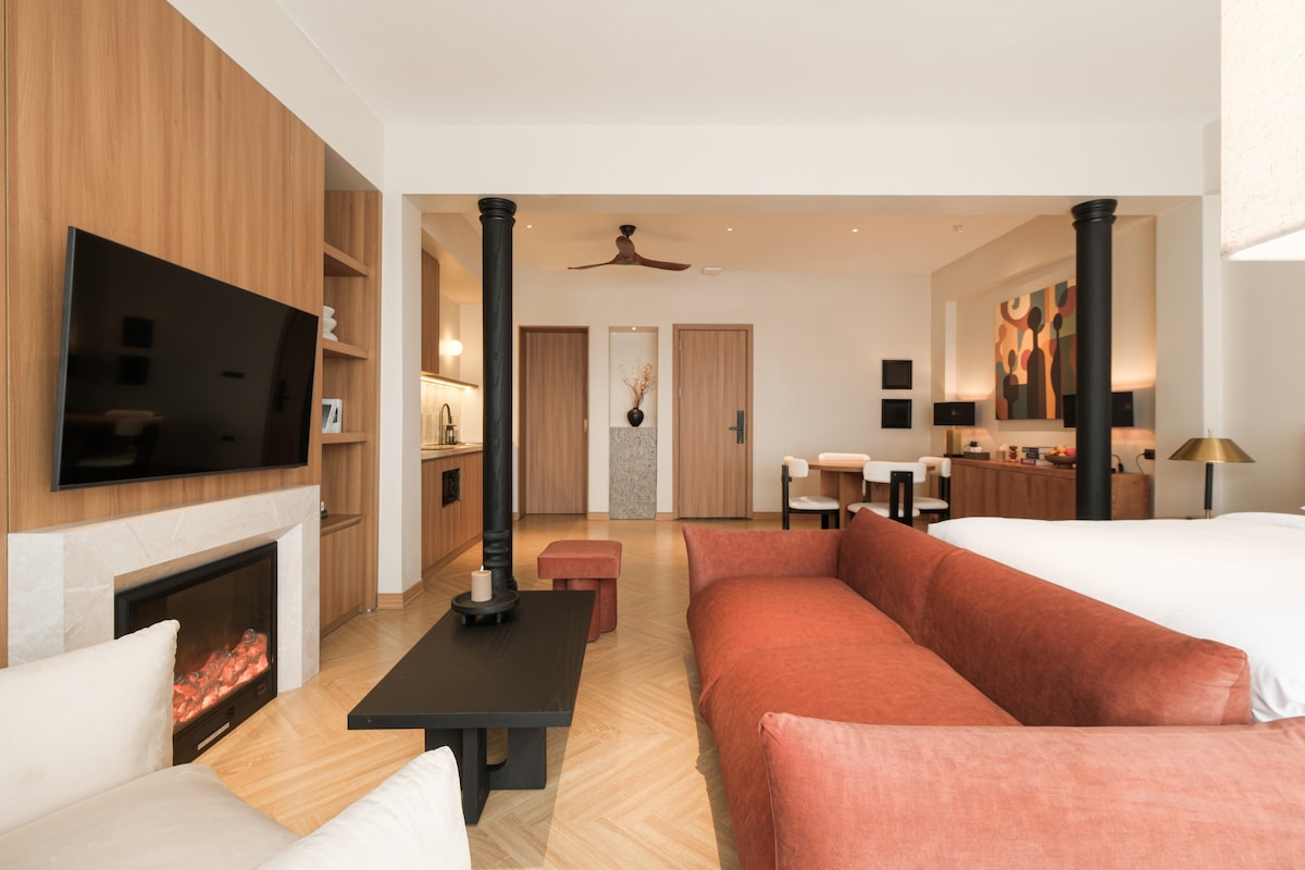 Gerbera The Montclair – Signature Loft with Large Window | Crafted Luxury Living A bright and cozy top-floor apartment featuring a large window that fills the space with natural light. Designed in warm Mid-Century style, it offers a spacious sofa, a soft comfortable bed, a stylish fireplace, and wood-tone furnishings that create an inviting, homely atmosphere — perfect for a relaxing stay in the heart of the city.