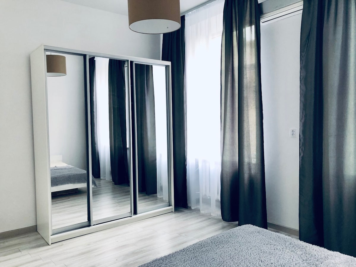 The apartment is a cozy two-room, one-bedroom space (50 sq.m), located in the very heart of Odessa. Access to the apartment is through a charming Odesa courtyard, with a secured front door, followed by a long hallway that leads to the second-floor apartment entrance. The bedroom, measuring 15 sq.m, is furnished with a comfortable queen-size bed and nice walk-in closet. A fold-out couch can be used for an extra guest. The apartment is equipped with everything necessary for a comfortable stay.