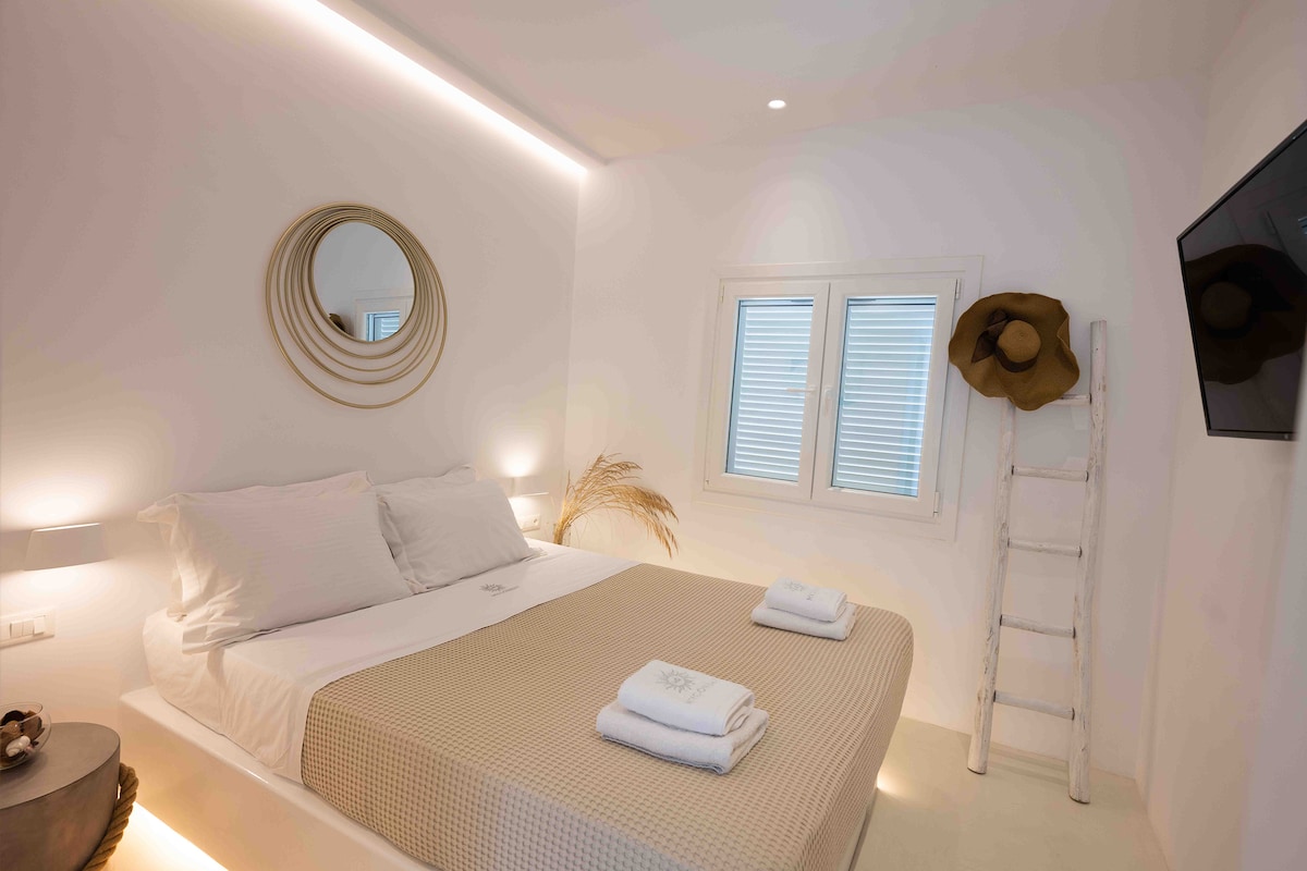 Enjoy Aegean sea views from stylish Deluxe Suite in Mykonos Town ("Legends in Town"). Designed by award-winning architect. Have a sip of wine at Private terrace with jacuzzi during the sunset. Relax on King bed with a high-quality mattress. Explore Mykonos town restaurants and boutiques within a short walk Highlights: * Stylish Sea Views * Jacuzzi on the Terrace * King Bed, High-Quality Mattress * Central but Quiet * Beautiful sunsets