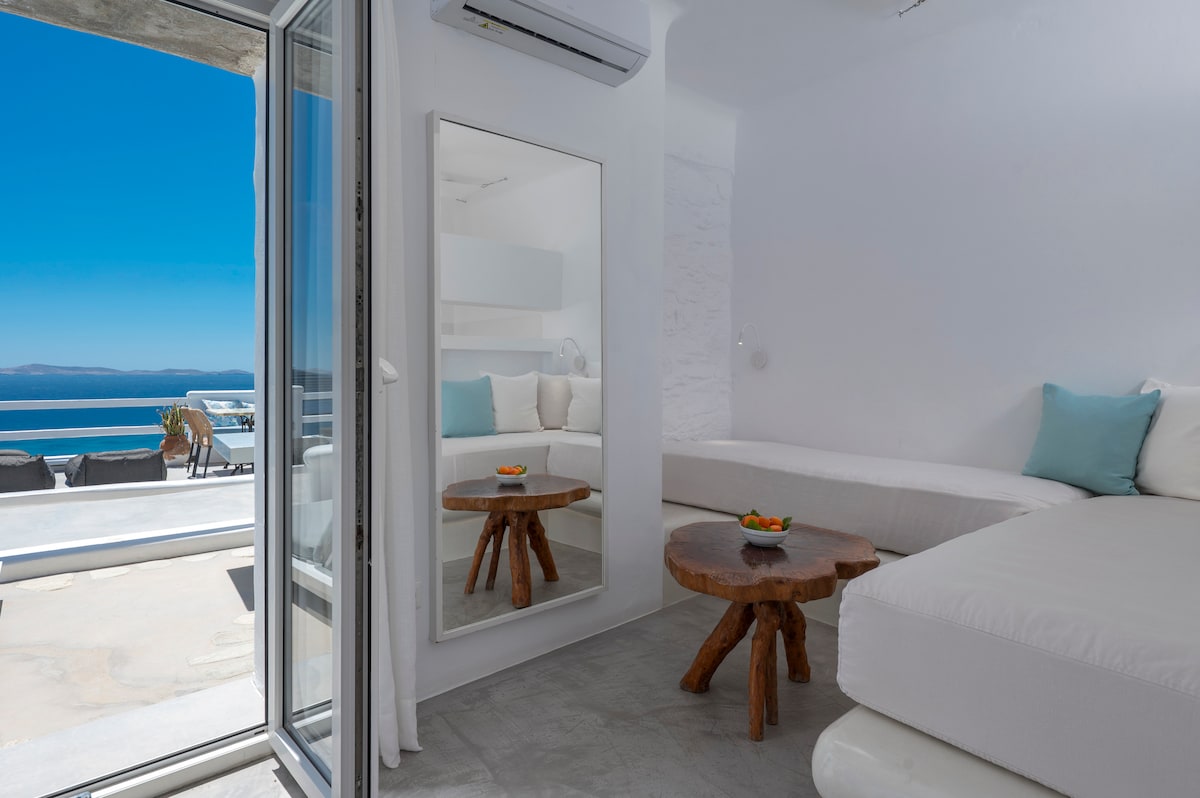 The suite is located at the top of the complex with uninterrupted stunning panoramic views of Delos,Naxos,Paros and the Aegean.Its secluded location offer its guest unlimited privacy.The indoor area is measured at 25sqm while the out- doors is 90sqm.From the double bed and the private pool, you can observe the breathtaking views.Inside the suite there there is an en suite bathroom with a shower and all the amenities necessary for you to have a wonderful stay.
