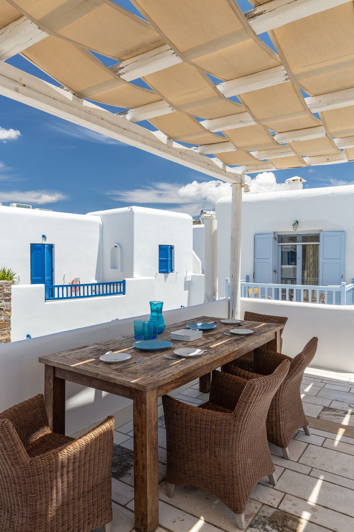 Blueisla Modern Mykonos townhouse! A house in the town with a private Parking. This newly renovated house is located in a tranquil area of the island and offers breathtaking views of the Aegean Sea. The house has all its necessary amenities upgraded and a terrace that gives a picture-perfect panoramic view of the Mykonos town, air conditioning that keeps the house ventilated even during the hot seasons of the year.