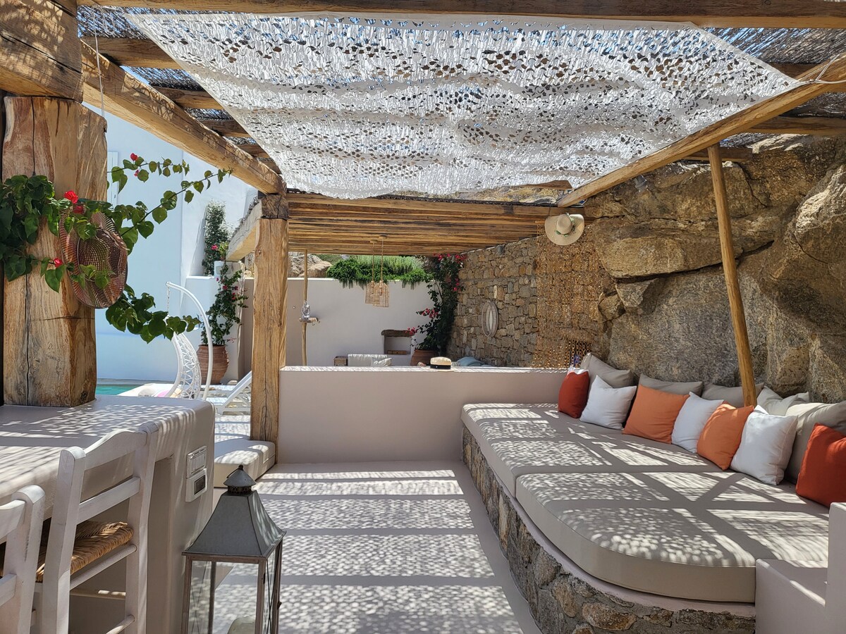 New studio designed using beautiful wood features. With king size bed and a full size single bed/sofa. A/C, TV, WiFi, mini fridge, coffee pot, private entrance and a Jacuzzi spa bath on terrace. Walking distance to Mykonos Town. Pool is open from at April. Breakfast is also available with extra charge