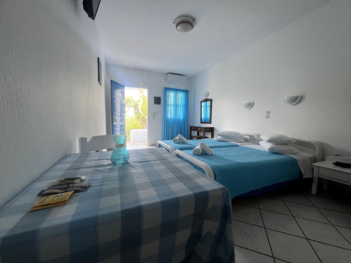 Newly created single/small double with A/C, WiFi, mini fridge, bathroom, TV. It is a cozy space and beautifully finished. Located under the front of the pool area. Access to a shared pool. Walking distance to Mykonos nightlife. A lovely complex of studios and suites with reception + parking. Rated number one or two for more than a decade. We look forward to hosting you. There is also breakfast available with extra charge