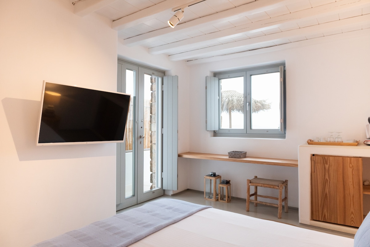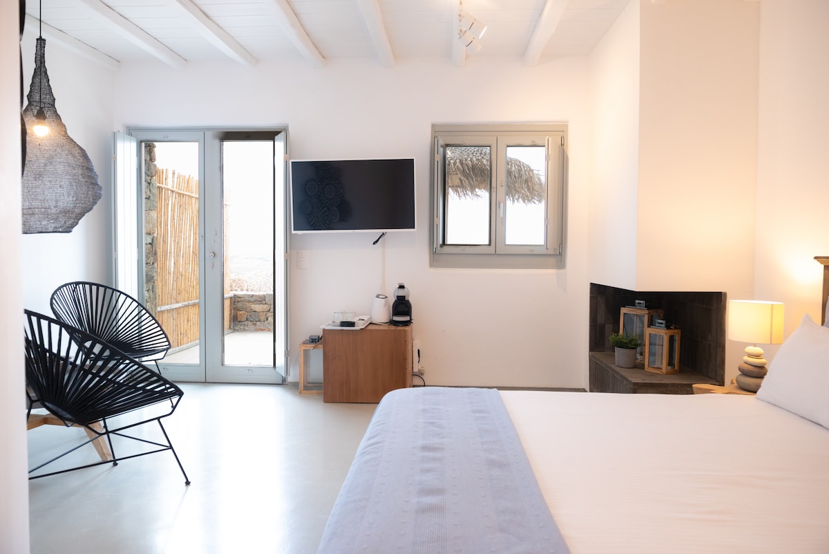 As you step into our Cycladic suite, you are greeted by an atmosphere of unparalleled calm. The design reflects the quintessential essence of the Cyclades, with its whitewashed architecture and minimalist aesthetics that seamlessly blend with the natural beauty of the surroundings. Each detail has been meticulously crafted to create a harmonious sanctuary that resonates with the spirit of Mykonos.