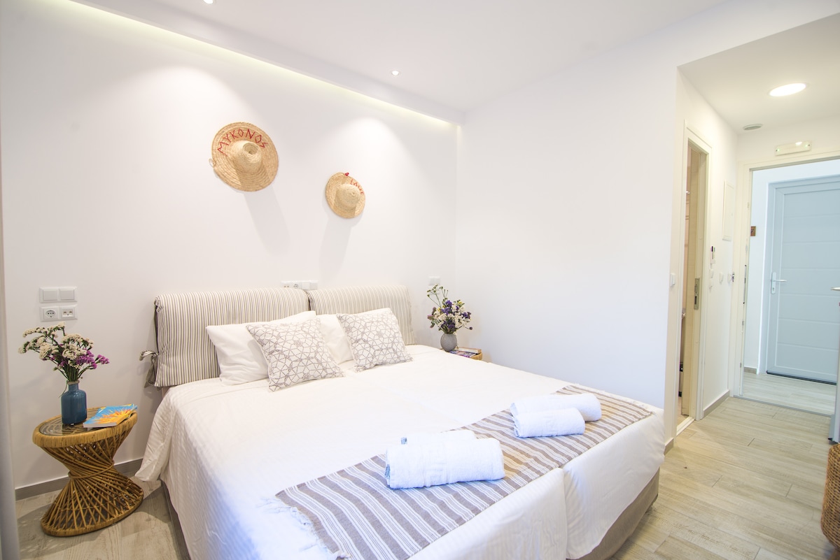Suite for two guests with private veranda overlooking the unique, beautiful Mykonos town( Sea View - Sunset view). Equipped with double bed at the bedroom , in-room equipped with a/c, smart 40 TV set, safe box, wireless internet access, refrigerator, esspreso coffee machine , cafe utensils, large bathroom with shower (30 sqm)