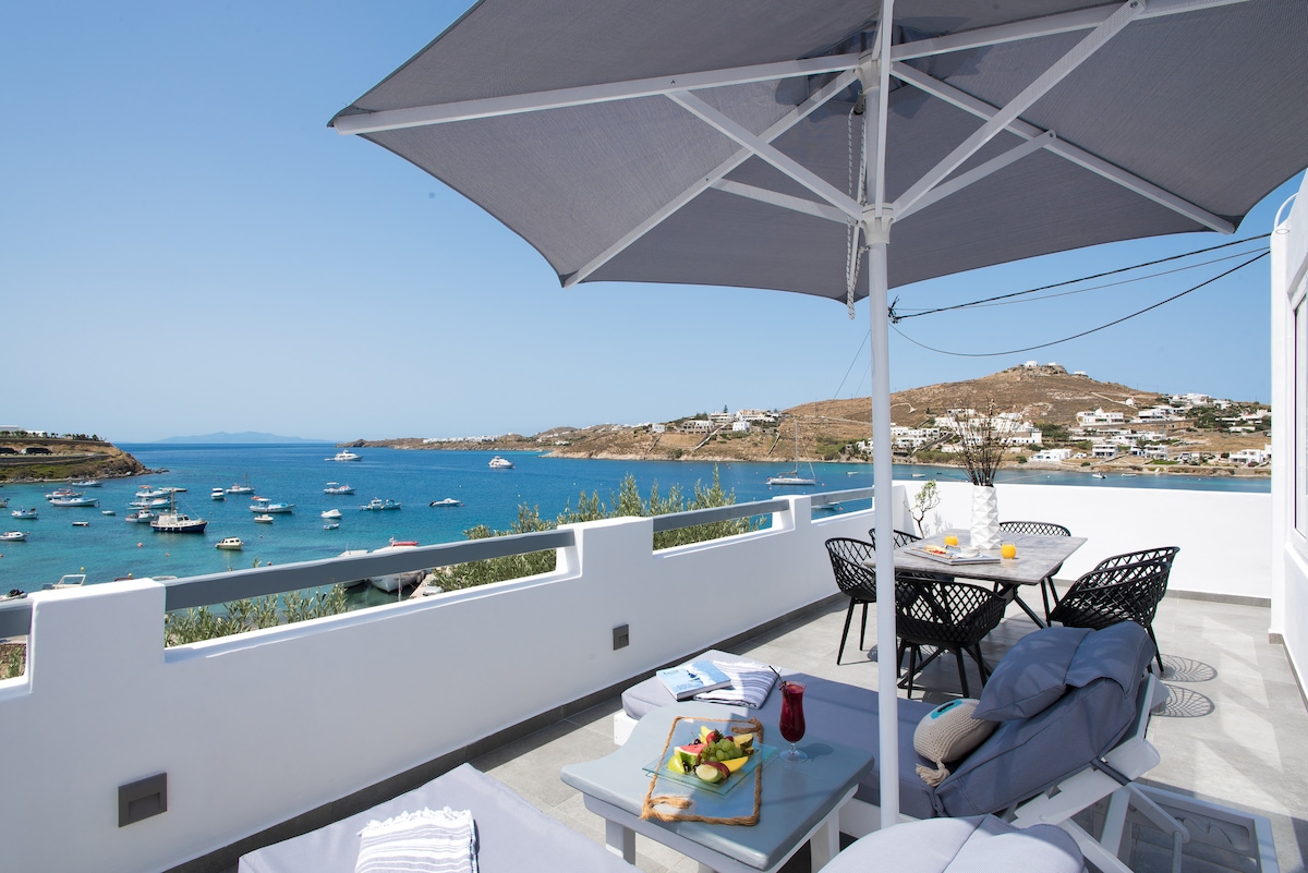 Modern minimal designed studio,sunny,comfortable and fully equipped in Platys Gialos.Private entrance,balcony with sea view,chic and relaxing ambient.A few minutes walk from the most cosmopolitan beaches of the island “Psarou beach”(Nammos), “Platys Gialos beach” and “Paraga beach”(Santanna, Scorpios).Just 3 klm from Mykonos Town.Very close to the bus station and boat bus station. Free Wi-Fi,A/C,TV,fully equipped kitchen,espresso machine,washing machine,iron,hairdryer,safe box,FAK,fire ext.,etc.