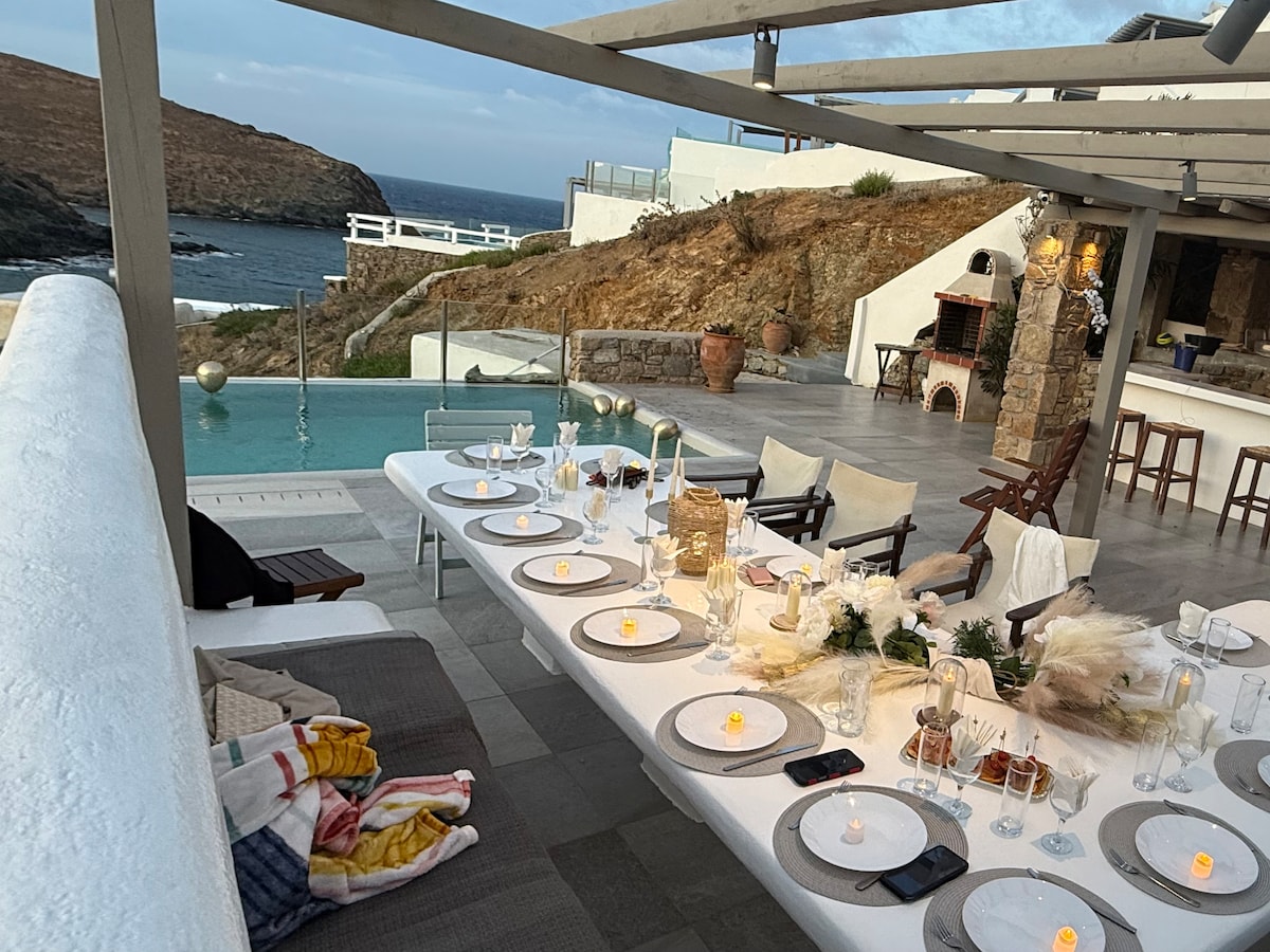 Miramare is a luxurius and elegant Villa with breathraking sea view, on the beach, consisting of 6 separate Suites that can accomodate up to 30 guests in 11 double beds and 6 sofa-double beds. Ideal for hosting events such as weddings, birthdays etc. It consists of 6 suites, 5 pools, 1 jacuzzi, bar, barbecue, loungers and dining areas. We provide daily cleaning, chef, transfers, daily cruises. 2 minutes walking from the beach, 10km from Mykonos town, 4km from Ano Mera with shops and restaurants.