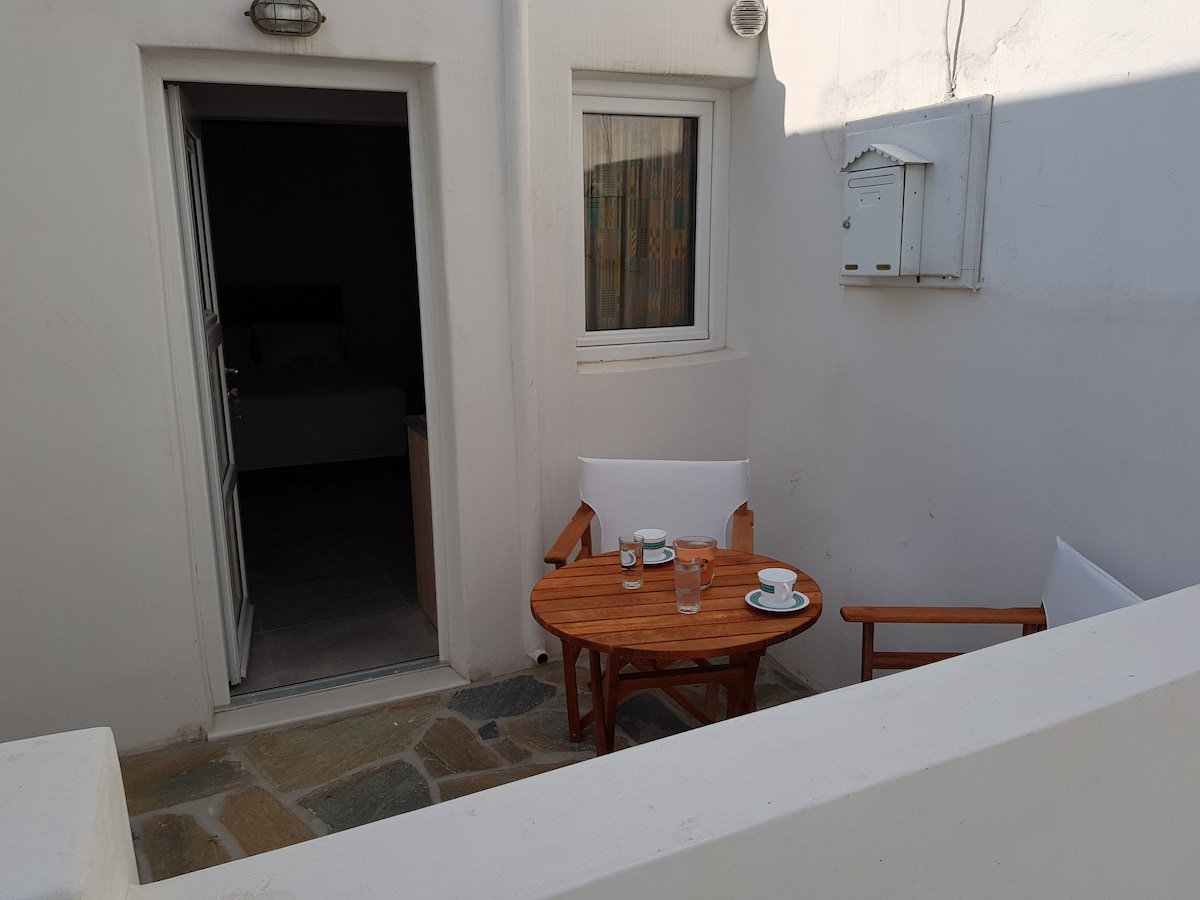 Comfortable independent studio with private patio in the heart of Mykonos town located under the landmark Boni's Windmill on the most photographed town steps.