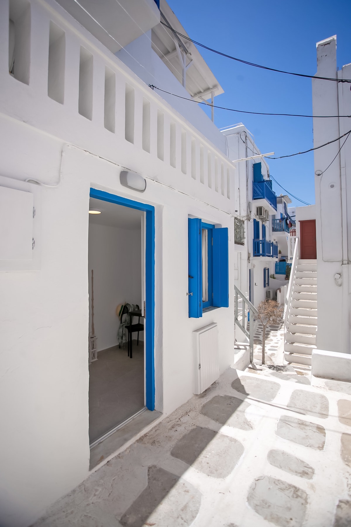 Stylish 5 maisonette in the heart of Mykonos Old Town! SPARKLING CLEAN Perfect for 2–5 adults (snug for 5 but totally doable). Kids welcome! 🛏️ 2 separate sleeping areas: Upstairs: 1 king bed Downstairs: 1 king bed + 1 single sofa bed 🚶♂️ WALKING DISTANCES: • Mykonos Town Beach – 2 min • Old Port Bus Station – 6 min • Old Port Parking – 9 min • Taxi Station – 5 min • Boutique Shopping – 0 min • Windmills – 9 min • Little Venice – 5 min