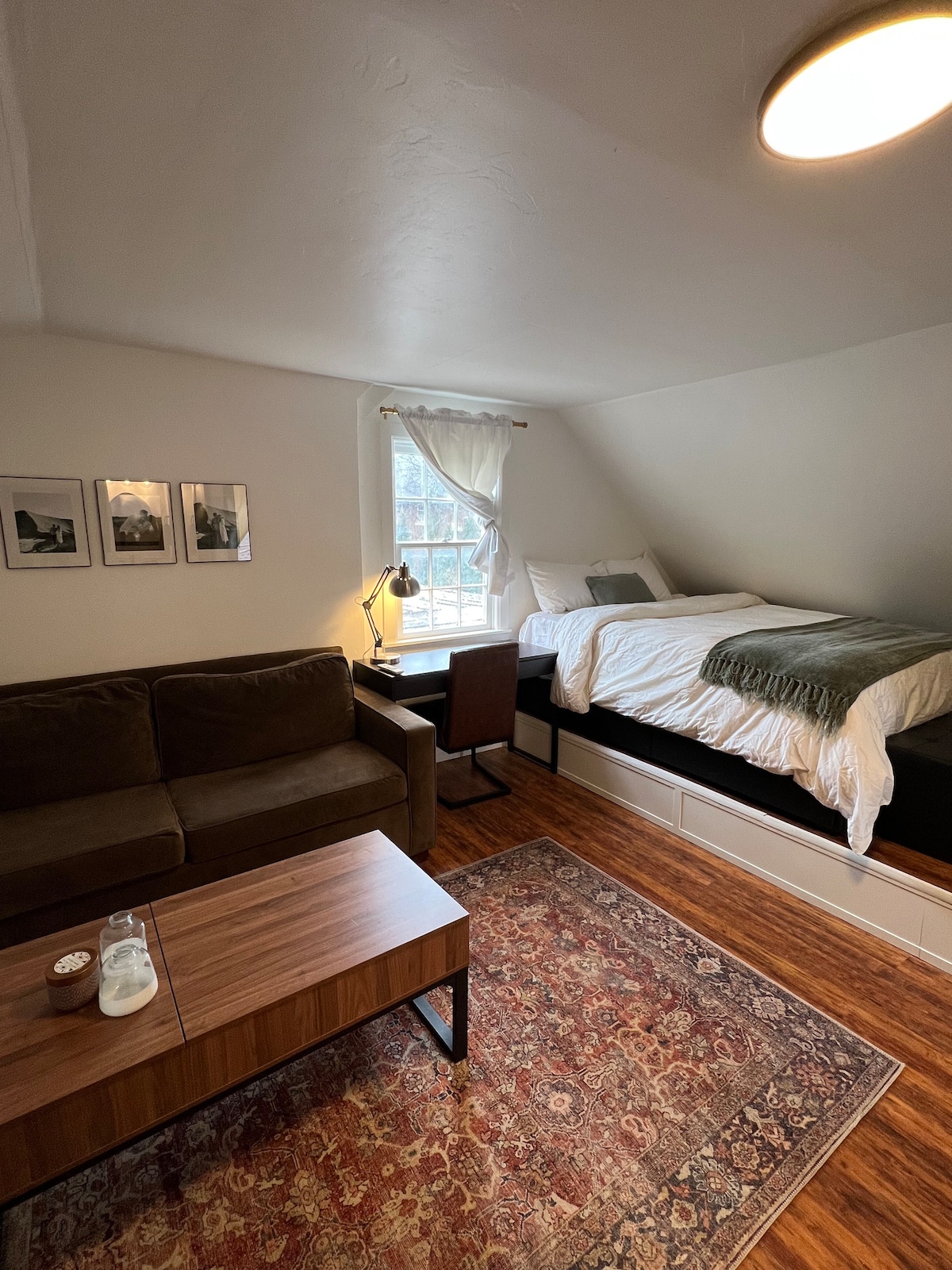 Beautiful garage apartment with unique hand-built glass garage door with lots of natural light. The main house is a duplex with two garage apartments in between. This listing is for one of the garage apartments. Premium 65-inch TV, Netflix, and high-speed Wi-Fi internet. Comfortable king-sized wrought iron bed and a handsome walnut desk for work/study.