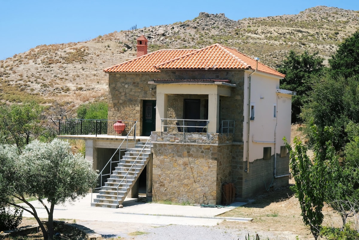 Όμορφο άνετο και ζεστό σπιτάκι με θέα το Αιγαίο πέλαγος.Βρισκεται στην άκρη του χωριού,χτισμένο πάνω σ ενα λόφο που δεσπόζουν τεράστιοι βράχοι!Μόλις δυο χιλιόμετρα απο την πόλη της Μύρινας και απέχει 500 μέτρα απο την παραλία του πλατύ μια απο τις ομορφότερες και πολυσύχναστες παραλίες του νησιού!