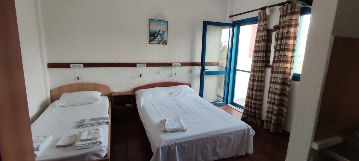 All studio are full of light and airy, for a pleasant & joyful stay. Each of the above types has a fully equipped kitchen with a refrigerator to facilitate preparation of any food or beverage. Moreover there is available free Wi-Fi & air-condition. The room balconies are shaded with their own furniture and chairs on which you can enjoy the spectacular view of the azure sea. The layers are anatomical and have the firm of coco-mat. Items additionally supplied: a device for ironing and a hairdryer