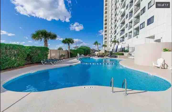 Experience the ultimate beach getaway at this centrally located condo, where you will be just steps away from dining options and mini marts. This resort-style destination boasts five pools, three hot tubs, a secure parking garage, a game room, and an on-site restaurant. Enjoy the lido deck, complete with drinks and food. Best of all, you’ll have direct access to the beach! The fully stocked kitchen including air fryer and crockpot, ensuring you have everything you need for a perfect stay.
