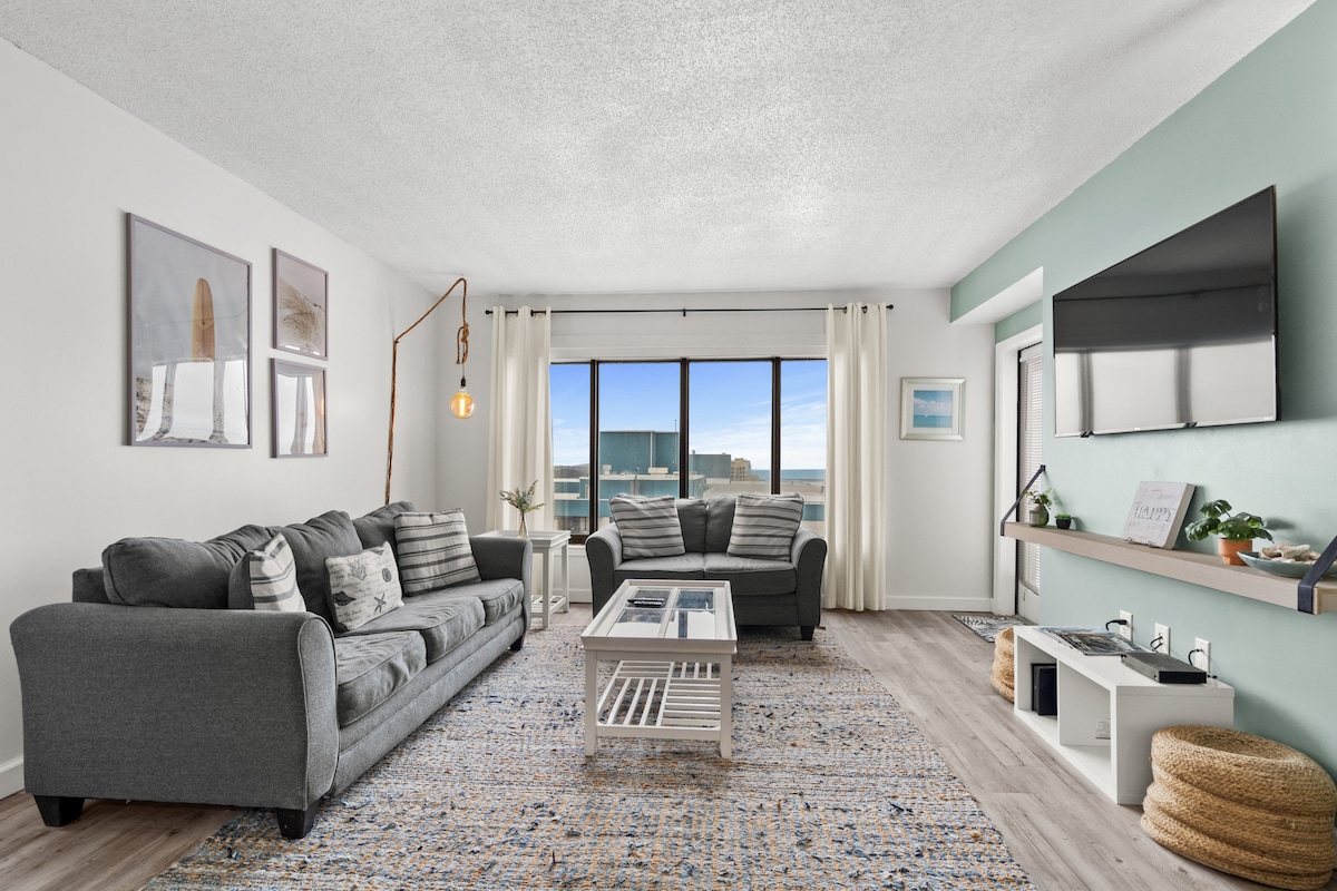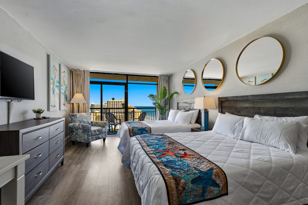 Welcome to The Sea Gem, NEW, COMPLETE REMODEL, 1 bdrm w/stunning ocean view! Located at Blue Water Villas Resort. Beach is a 1-minute walk, pools, spas, gym access, walk to attractions, mini golf, restaurants, pickleball/basketball/tennis. FREE amenities at Blue Water Resort, WIFI, FREE PARKING! Non-smoking, pet free, king-size brand new bed & queen sofa sleeper. Family friendly with packnplay, highchair, games, puzzles, books. Kitchen stocked for basic cooking, fresh linens/towels included.