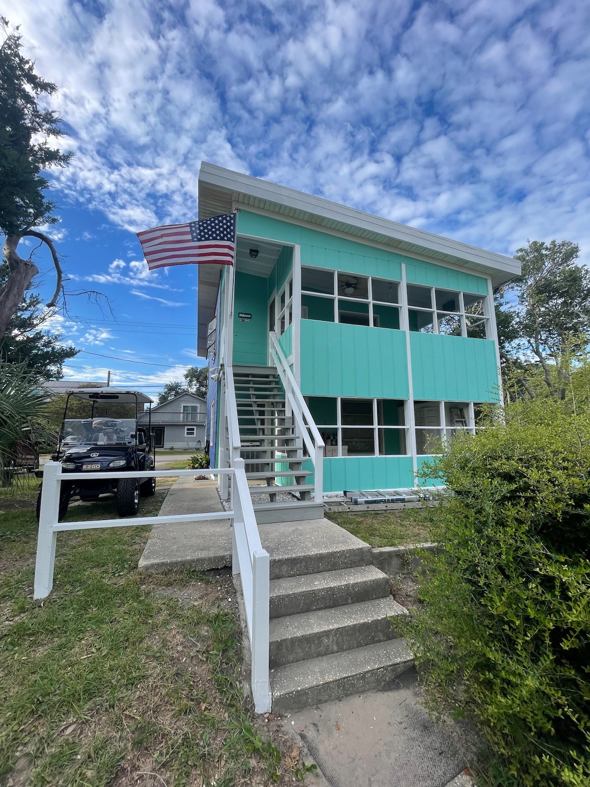 This is a new, completely redecorated beach rental 2024. Two King bedrooms, a double twin bedroom and a Queen pull out sofa. In the living room. This is a 2 1/2 bath. Best suited for 6 people, but with the sofa sleeper, we can take up to 8. Shared pool is just behind the house and beach is less than 150 steps away. Washer and dryer upstairs. We have beach chairs for eight, a cooler, beach buggy and all of your towels and linen you need. We look forward to hosting you at our beach cottage.