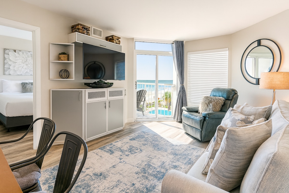 Enjoy Ocean Views from Private Balcony - Keurig K-pod and Drip coffee Makers - Comfortable Bedroom: Two cozy queen-sized beds. - Sleeper Sofa: In the living room. - Fully Equipped Kitchen - 55" Smart TV in Living room and Bedroom Resort Amenities: - Indoor/outdoor pools - Hot tubs - Lazy river. - Fitness Center: - Free Wi-Fi - Stay Connected - Direct Beach Access - On-site attached parking available. - Central Location: - Close to Myrtle Beach Boardwalk, SkyWheel, and local attractions.