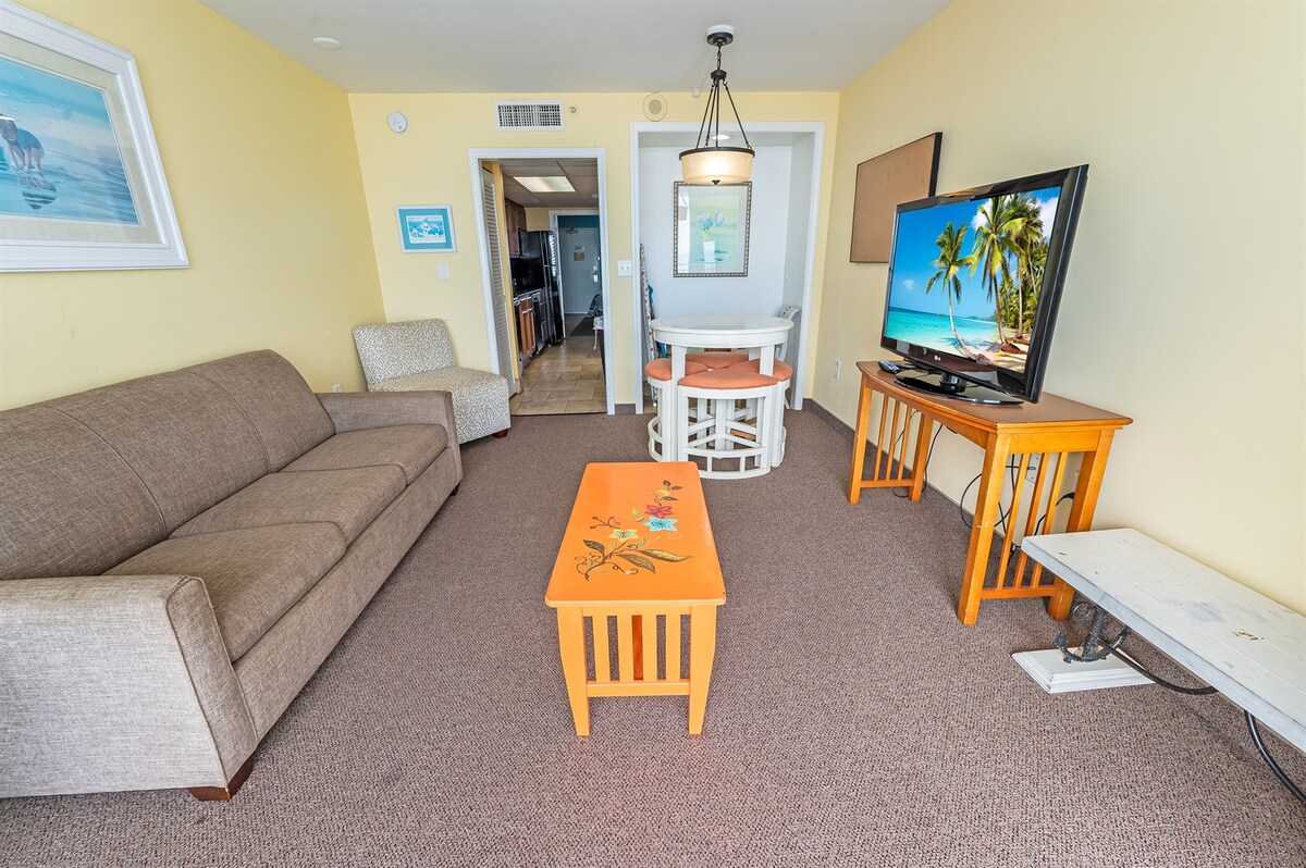 This condo at Camelot by the Sea is centrally located to the heart of Myrtle Beach both driving and walking. Find the beach just a few steps away. The newly renovated condo even offers a fully functional kitchen with everything you need to make this your next WFH getaway stay-cation. Comfy living room with a fold out sofa bed. Catch all of your favorite entertainment on one of the two large LED TVs, or better yet, enjoy the multiple pools, hot tub, and a lazy river that you can float in all day.
