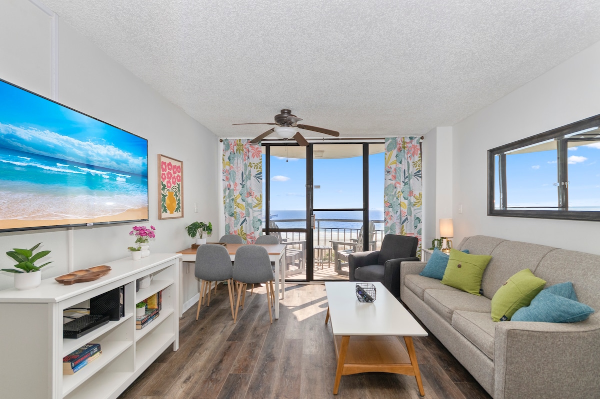 Enjoy special winter rates and a front-row seat to the seasonal dolphin migration often visible right from your 21st-floor balcony! This oceanfront condo has unbeatable views and direct beach access right across the street. Freshly furnished and newly updated - including a new couch! The building features both indoor and outdoor pools for year-round swimming. It's close to the action but on a calmer stretch of sand and I’ll bend over backwards to make your stay amazing.