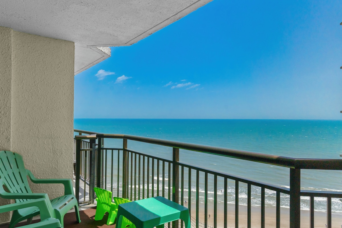 END UNIT PENTHOUSE! HUGE PRIVATE BALCONY AND THE BEST VIEW in the Building! PERFECT GETAWAY FOR COUPLES, FAMILY, FRIENDS!!! NON-SMOKING INCLUDING BALCONY. NO PETS. Perfect for Honeymoon / Anniversaries. Golf/Beach Get-Away for SIX. Celebration of a Birthday or just a GREAT beach getaway to celebrate life! DIRECT OCEANFRONT PENTHOUSE IN DOWNTOWN Myrtle Beach, Prime location convenient to so many great restaurants, bars, entertainments, come to enjoy this condo and wash all your worries away.