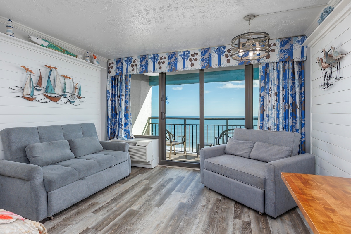 Extremely rare, top floor of unit type, center of building which has largest and widest balcony. Fully updated, high end finishes, king bed and sleeper in hybrid living room/bedroom(meaning combined) and full bed in second bedroom. High end kitchen with wrap around bar and granite, new appliances, custom bathroom with large soaker tub and custom sink and granite. Coastal vibe with decor and large tvs. Best view in town with expansive balcony with lounger and high top chairs.