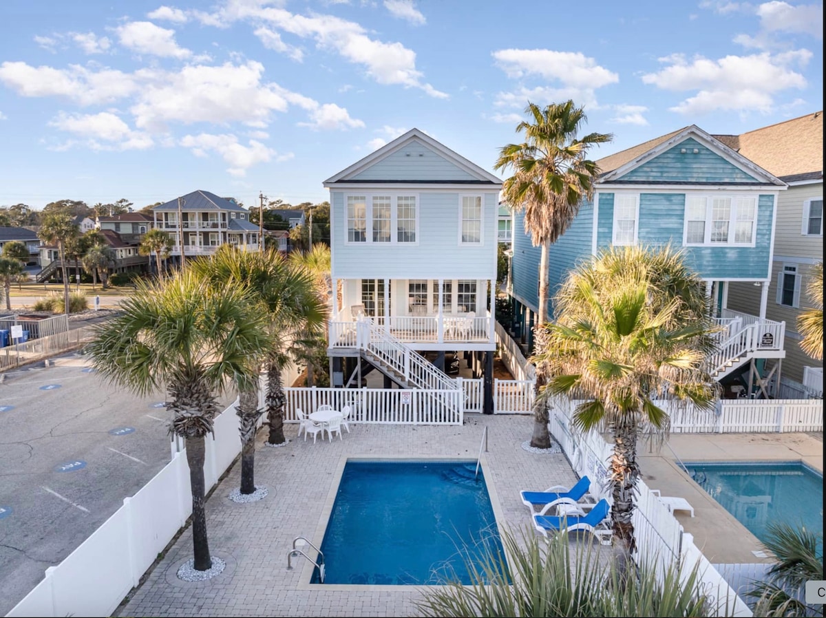 Enjoy our 2nd Row, Newly Constructed Dream get-a-way Paradise with Family and Friends! This 2 story home has 5 Bedrooms, 4 Full Baths, 2 Social Gathering Rooms, and Kitchens Up & Downstairs. From the bottom balcony, enjoy a 60 second walk to the Beautiful Sands of N. Myrtle Beach. You will also enjoy a Private Pool with Night Lights for evening swims! And don't forget the adjustable hoops bball goal, 2 Beach Bikes and a 5 minute walk to local gift shops, restaurants & incredible Parasailing!