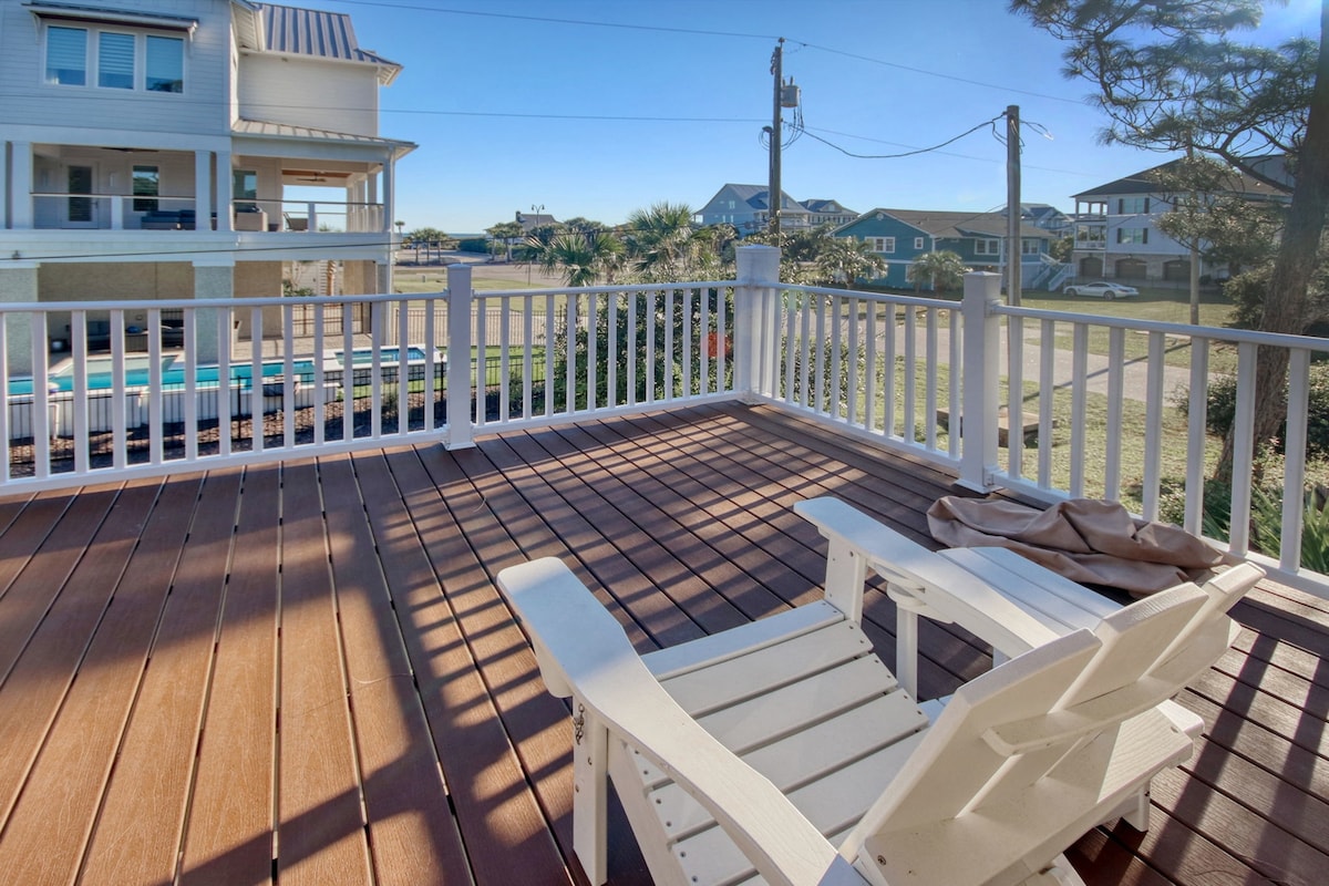 Kick back & enjoy being beachfront in this calm, stylish house. With a huge deck (half is screened) overlooking the waves and once-in-a-lifetime sunsets, you can create all of the memories for years to come. 4 bedrooms, 3 baths, single family home on stilts. Walking distance to local restaurants. *Christmas Decor from Nov29-Jan10 *Credit towards golf cart rental (only Nov-Feb >5 nights booked) *Pool can be heated for an additional fee *FREE beach photoshoot with 7 night rental