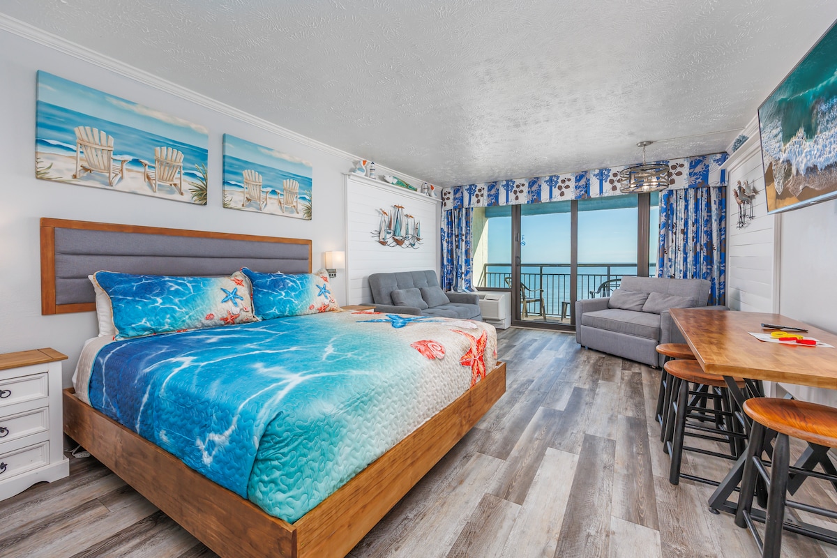 Lil' Salty is a remodeled oceanfront 1-bedroom condo (sleeps 4) at the pet-friendly Patricia Grand Resort. Enjoy resort amenities like heated pools, 4 hot tubs, a lazy river, and direct beach access. New mattress, sofa, and more added in Spring ‘24. Free parking for 2 vehicles. Just minutes from attractions, golf, and the airport. Enjoy amazing ocean views, plus a clean, updated space with extra touches like beach gear and pet-friendly amenities. Perfect for family fun or a romantic getaway.