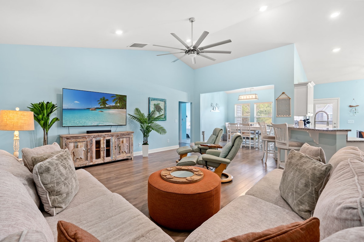 Peaceful retreat, Tiki hot tub, book your perfect spring stay! *Senior & Military Appreciation Perk. Message for details. *Only 10 Minutes to the Ocean & Airport *BR 1: Queen, bath, TV, patio entrance *BR 2: Two Queens, couch, TV, bath, balcony *BR 3: Queen workspace/desk; 1/2 bath *BR 4: Full with adjoining livingroom, TV, 2 sofas * spacious home perfect for your group to relax and create memories! *Dog friendly!
