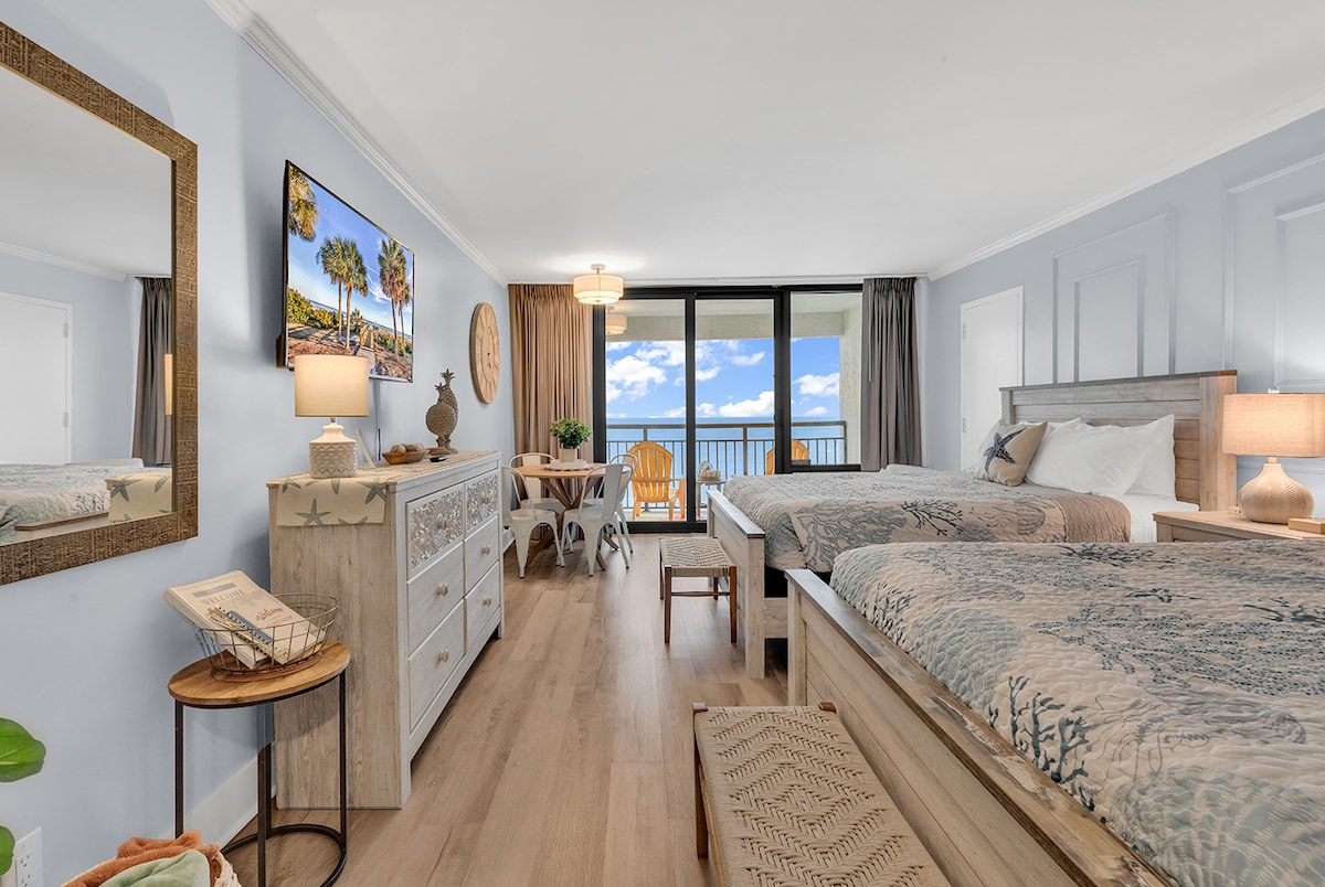 Let the beauty of the sea embrace you in this gorgeous, oceanfront studio. Check out our reviews to see how well we care about your experience! Every corner exudes pristine cleanliness, charm and details, with everything you need to create your perfect escape! Nestled in the popular Sand Dunes Resort, set against the tranquil Golden Mile, this gem is your gateway to everything Myrtle Beach has to offer. Your oceanfrontl haven awaits! Book now and unlock the door to an unforgettable experience!