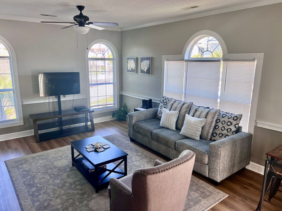 This condo at Camelot by the Sea is centrally located to the heart of Myrtle Beach both driving and walking. Find the beach just a few steps away. The newly renovated condo even offers a fully functional kitchen with everything you need to make this your next WFH getaway stay-cation. Comfy living room with a fold out sofa bed. Catch all of your favorite entertainment on one of the two large LED TVs, or better yet, enjoy the multiple pools, hot tub, and a lazy river that you can float in all day.