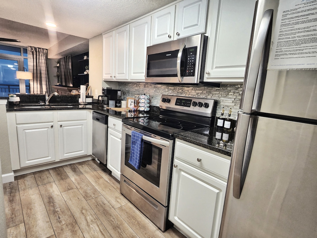 Completely renovated in 2022, oceanfront condo with quartz counter tops, shaker style cabinets & stainless appliances, new living, dining and bedroom and furniture, flooring, 55in Roku TV, High Speed Internet, new bedding, lighting & more! It's modern, crisp, casual and comfortable! We've provided lots of home conveniences & plenty storage for your own comforts from home. Located in the heart of MB & a short walk to many restaurants, coffee shops, bars, convention center, boardwalk & much more!
