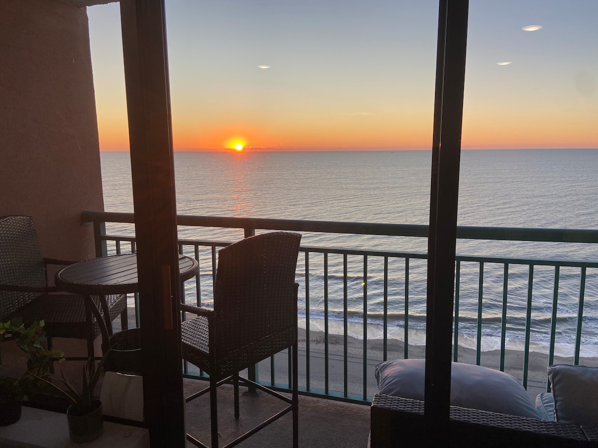 Nothing sweeter than waking up to ocean sunrise or watching the moon shimmer on the beach at night from a super comfy King size bed. Relax or enjoy coffee on this private Oceanfront balcony with a ravishing view in the morning or after a fun day at the beach. This luxury condo is perfect for people watching or walking out onto the soft powdery sand with a loved one. No need to get back into a car when you can walk to experience all the fun, energy and great food at downtown Myrtle Beach.