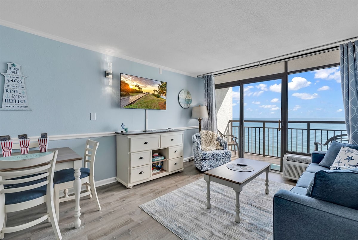 Experience breathtaking ocean and sunset views from our Super Clean, 5-star rated condo on the 8th floor. "OCEAN BLUE" is a spacious 1-bedroom layout with a king size bed, full kitchen, large balcony, smart TVs and a fireplace. Located in a prestigious area of Myrtle Beach known as the Golden Mile, minutes away from restaurants, shopping, and attractions. Book now for the ultimate MB getaway! Washer\dryer located inside the condo. This condo is also available for longer term winter rental.