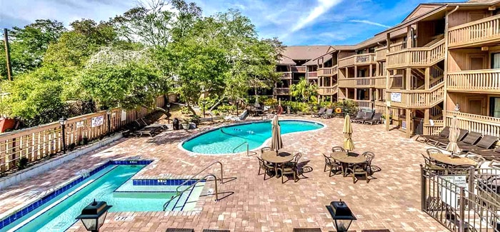 Nestled on the Golden Mile's Cabaña Row, Forest Dunes Resort offers a prime oceanfront location. Our spacious condo, centrally positioned within the building, boasts breathtaking views of the ocean, pools, hot tub, and lazy river. Enjoy easy beach access with the resort’s private cabaña, plus beach chairs, beach towels and umbrellas all included. For relaxation and dining, head to Bucket's Oceanfront Bar & Grill. Our commitment to providing exceptional stays shines through in our guest reviews.