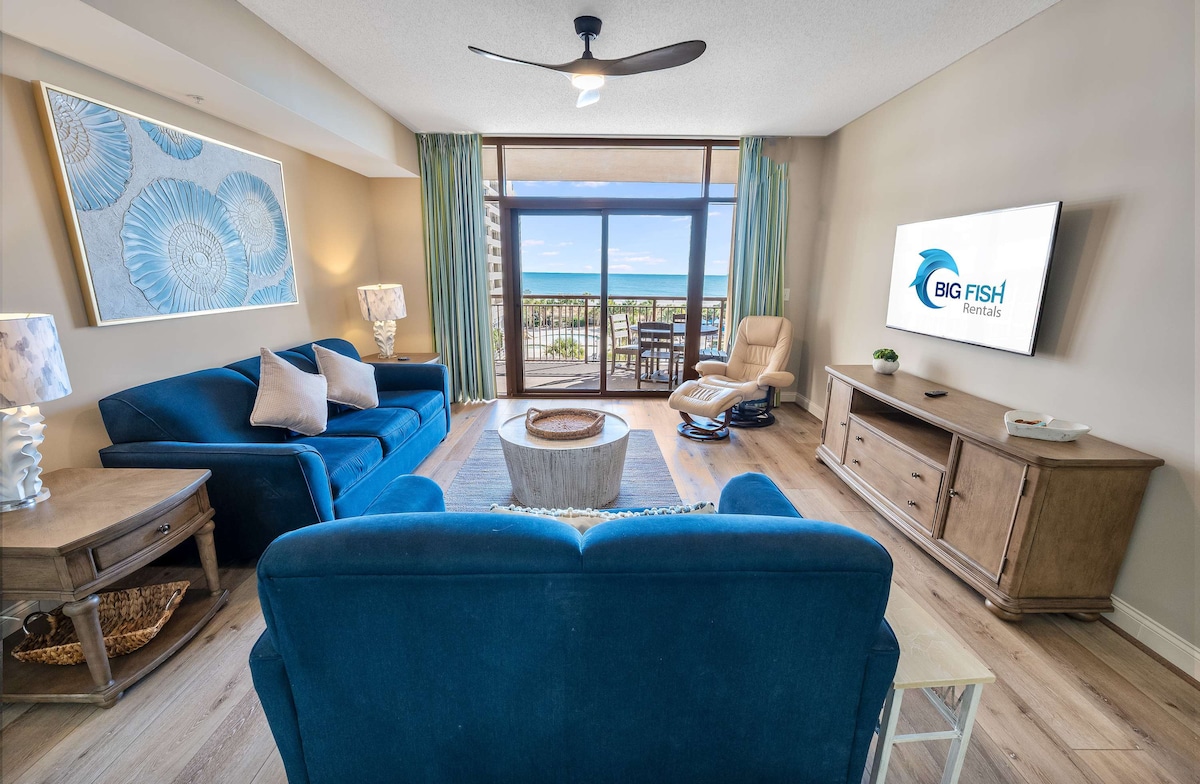 Relax with the whole family at this peaceful ocean front high rise condo. Enjoy the ocean front balcony with incredible views for miles up and down the beach. This 2 bedroom and 2 full bath condo is extra clean and all new from top to bottom. Beautifully appointed with ocean front master suite and a second bedroom with 2 Queen beds and ocean views. Come enjoy a week or even 2, we look forward to having you and making sure you have a wonderful vacation experience.