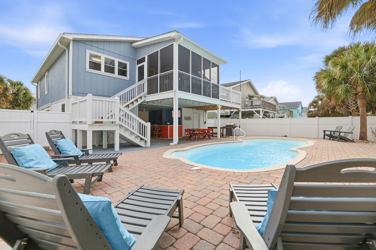 Beautiful, newly renovated 4-bedroom raised beach house only 2 blocks from the ocean. Plenty of room for outdoor entertainment with a large pool area surrounded by palms and access to a salt marsh for fishing. Only moments away from Barefoot Landing shopping, golf, and nightly entertainment. In consideration of younger guests, younger than 25, a dep $1500 will be required before check-in and 2 prof references sent directly to gkladd@comcast.net from nonrelatives older than 25 years of age.