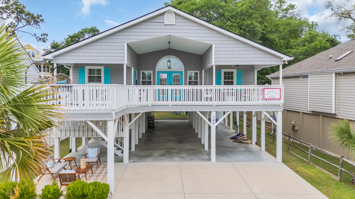 "Attitude Adjustment" is a luxury channel home with a walkway and floating dock giving access to the canal for your fishing and boating pleasure. Home features 4BR, 2BA. Short one block walk to Cherry Grove Beach. Everything you need for your beach vacation in a raised channel home with your own private pool. Guests will find all of the modern conveniences of home, but with a rustic coastal feel.
