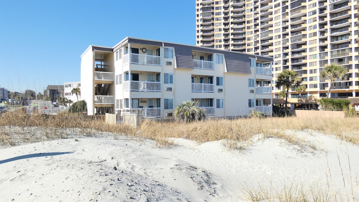 Incredible direct oceanfront large one bedroom condo at the beautiful Beach Colony Resort located just two miles due north of the downtown area of Myrtle Beach. You'll wake-up to great sunrises and the soothing noise of the Atlantic ocean. This is a one bedroom, king bed, that is separate and private from the living area. The living area has a sofa bed couch (queen sized). Besides all the pools and spas, there is an onsite bar and restaurant with a huge game room which includes pool tables!