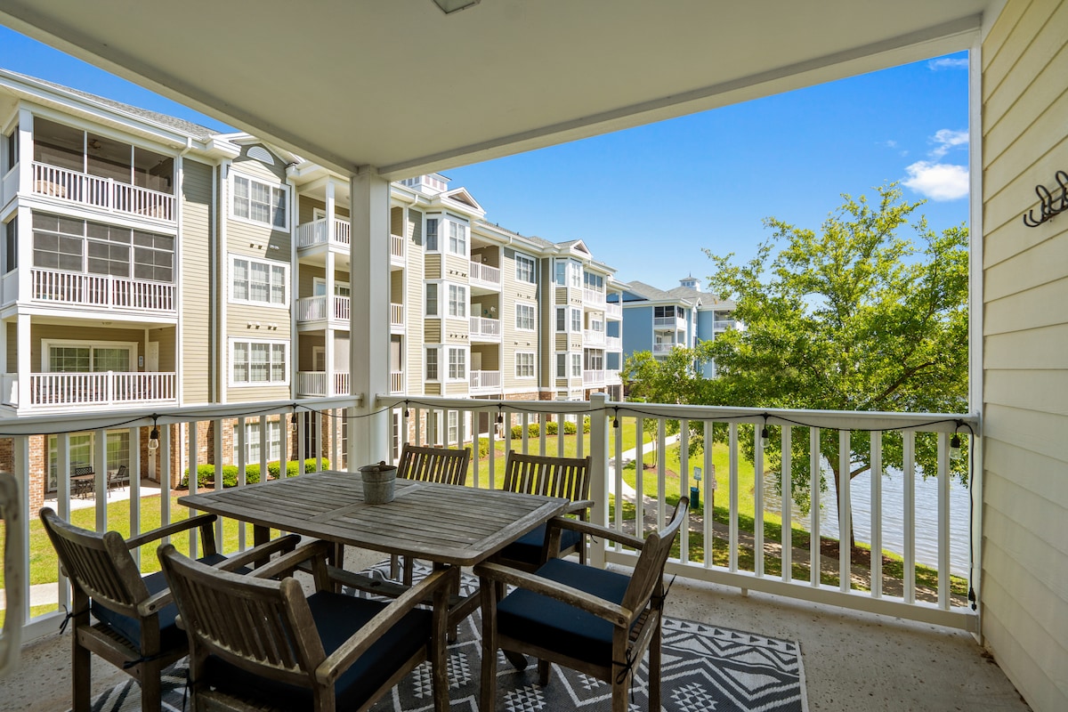 Come enjoy this newly renovated, serene 3rd fl condo! Sip your coffee (or wine ;) ) overlooking beautiful views of River Oaks Golf Course & The Intracoastal Waterway! Unwind after a beach day in the peaceful pools & hot tub, relax in the gazebo and watch the boats go by, try some fishing off the onsite pier, bring a kayak to explore, or visit the sports courts - all right here! Secure, quiet gated community less than 5 miles to the Beach, Boardwalk, Airport & 8.5 miles to CCU.