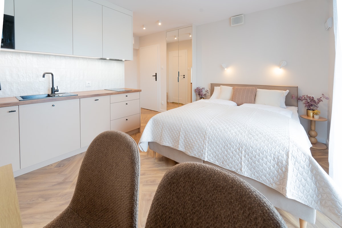 Welcome to Rose Studio - a stylish and cozy space with a comfortable king-size bed, perfect for relaxing after a day in the city. The studio features a private bathroom with shower, a fully equipped kitchenette with dishwasher, induction hob, kettle and microwave. Enjoy air conditioning, a work desk, Smart TV and fast Wi-Fi. Step outside to your private terrace and enjoy your morning coffee. Ideal for business or leisure stays!