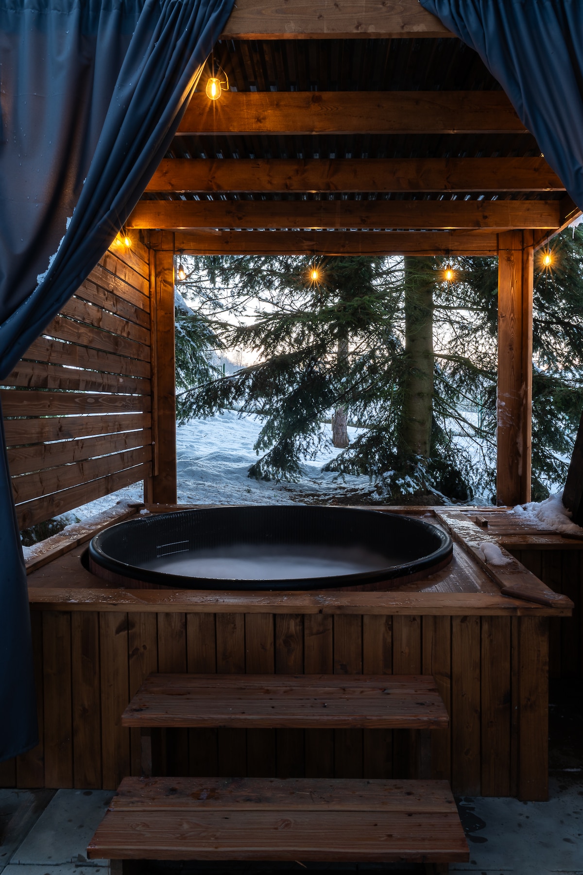 Dom z bala do wynajęcia - Polana Słowikowa. Otoczenie drzew, zieleni i ptaków sprawi, że poczujesz się tu wyjątkowo. Piękne duże okna sprawiają, że czujesz się tu przestronnie. Wszytsko jest nowe i zaprojektowane tak abyście czuli się tu nawet lepiej niż w domu. Zadbaliśmy o komfort stawiając na wyjątkowe i komfortowe rozwiązania takie jak zewnętrzny basen z podgrzewaną wodą, jacuzzi/ balia na tarasie z aeromasazem i oświetleniem, sauna, plaża z leżakami i parasolkami i placem zabaw.