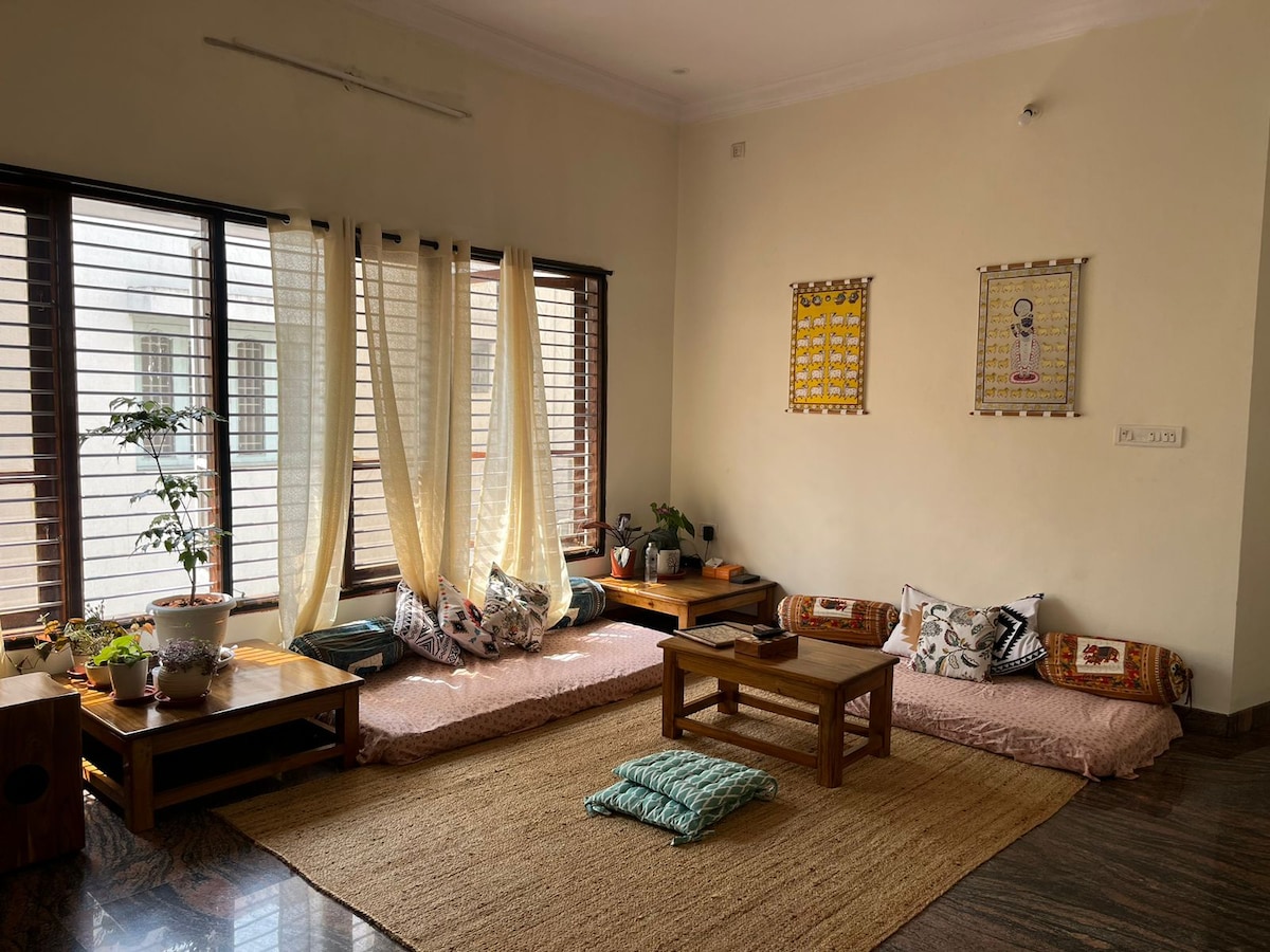 Reconnect with nature at this unforgettable escape.Forget all you negativity in the midst of chirping birds and tender sunshine. Perfect place for all those who wants to relax in the midst of work burden The house is in prime location, around 7km from the railway staion and 10 km from Bus stand Suyoga Multispeciality hospital is 100 m at reach cycling also avalibale kukkrahalli lake lingambudi lake are just 2 km away from the place. sorry we wont host unmarried couples