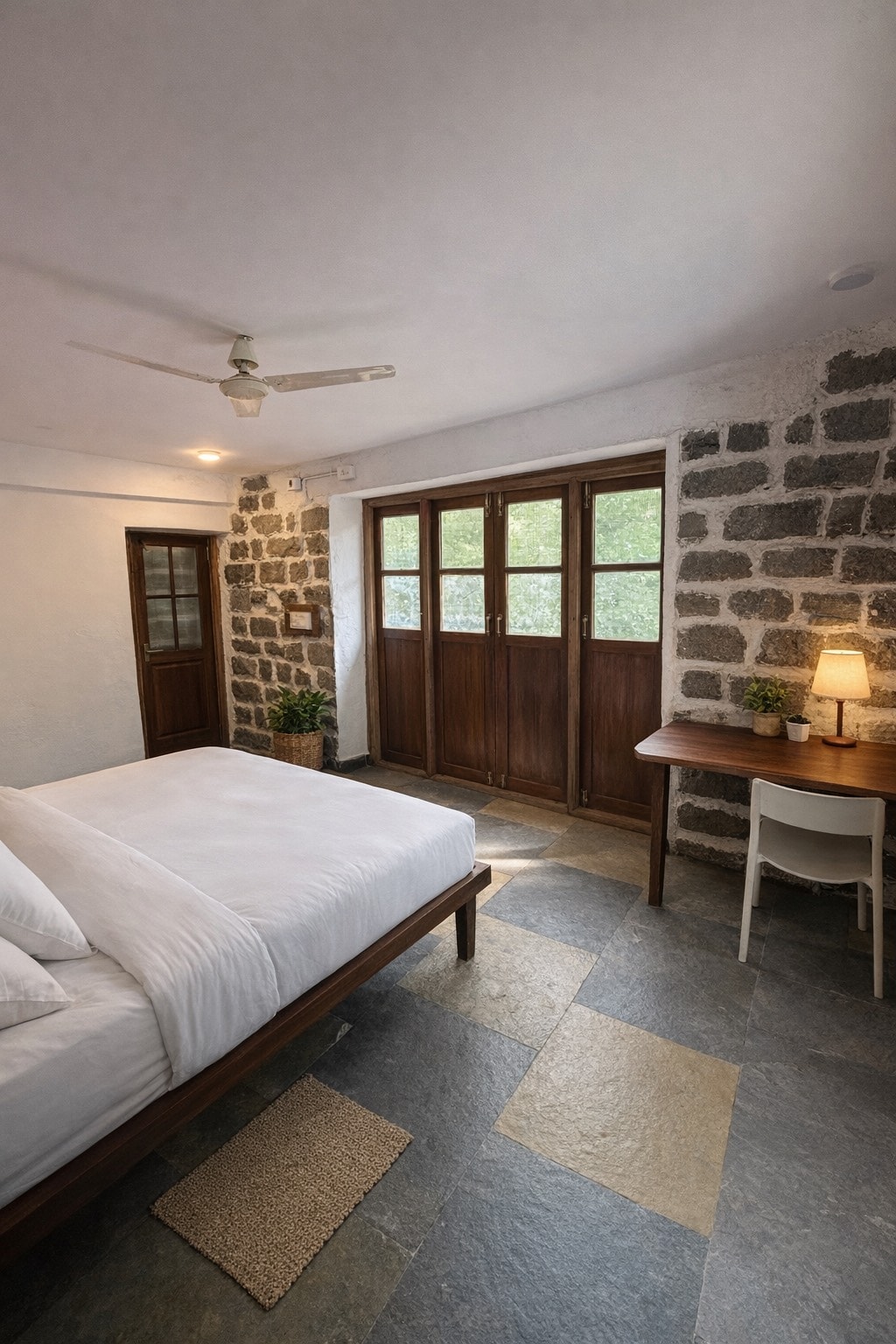 The Scenic Room on the second floor offers serene elevated views of the lush farm and surrounding lake area. Designed for couples or small families, it combines comfort with nature’s charm. The room opens to a large private Balcony area, perfect for morning coffee, Sunset relaxation, or simply soaking in the peaceful countryside ambience, creating a soothing retreat after a day by the pool or outdoor activities.