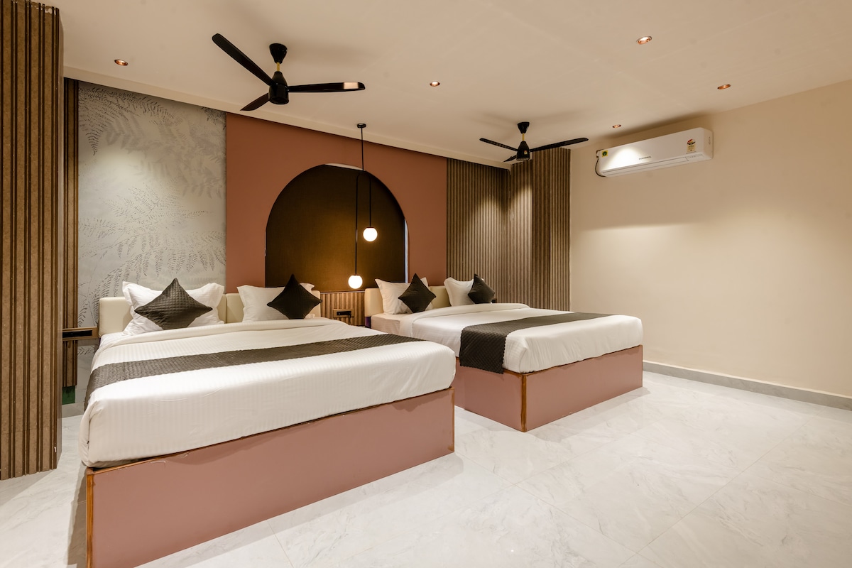 Enjoy a calm, clean, and comfortable stay designed for relaxation and convenience. Our modern rooms feature warm wooden interiors, plush bedding, natural daylight, free high-speed Wi-Fi, flat-screen TV, workspace, and hygienic attached bathrooms with hot water. Dine at our pure vegetarian restaurant serving fresh meals. Guests also enjoy free private parking, a peaceful environment, and excellent cleanliness.