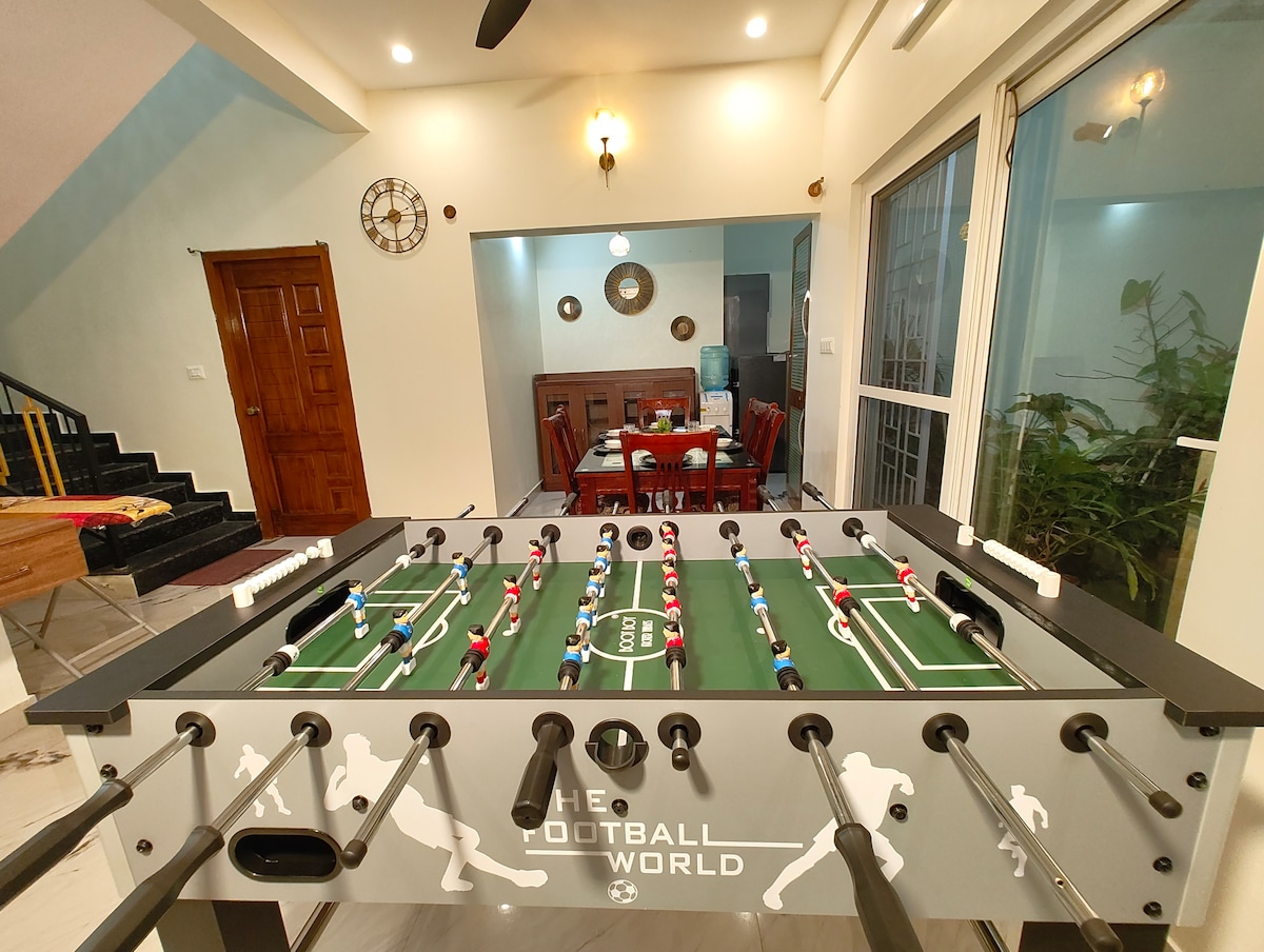 " Casa de Shalom" on Google maps for exact location. Experience luxury living with your friends & family at this brand new 3Bedroom(AC) spacious villa in Mysore with a , 65" LED TV & a 56" Foosbal table. This stunning 3 bedroom, 3-bathroom & a Fully equipped kitchen. It is located in Hale Kesrae and is 16mins(9kms) from Mysore Palace. Well suited for friends and family who are looking to relax in a luxurious setup during their visit to the 'City of Palaces