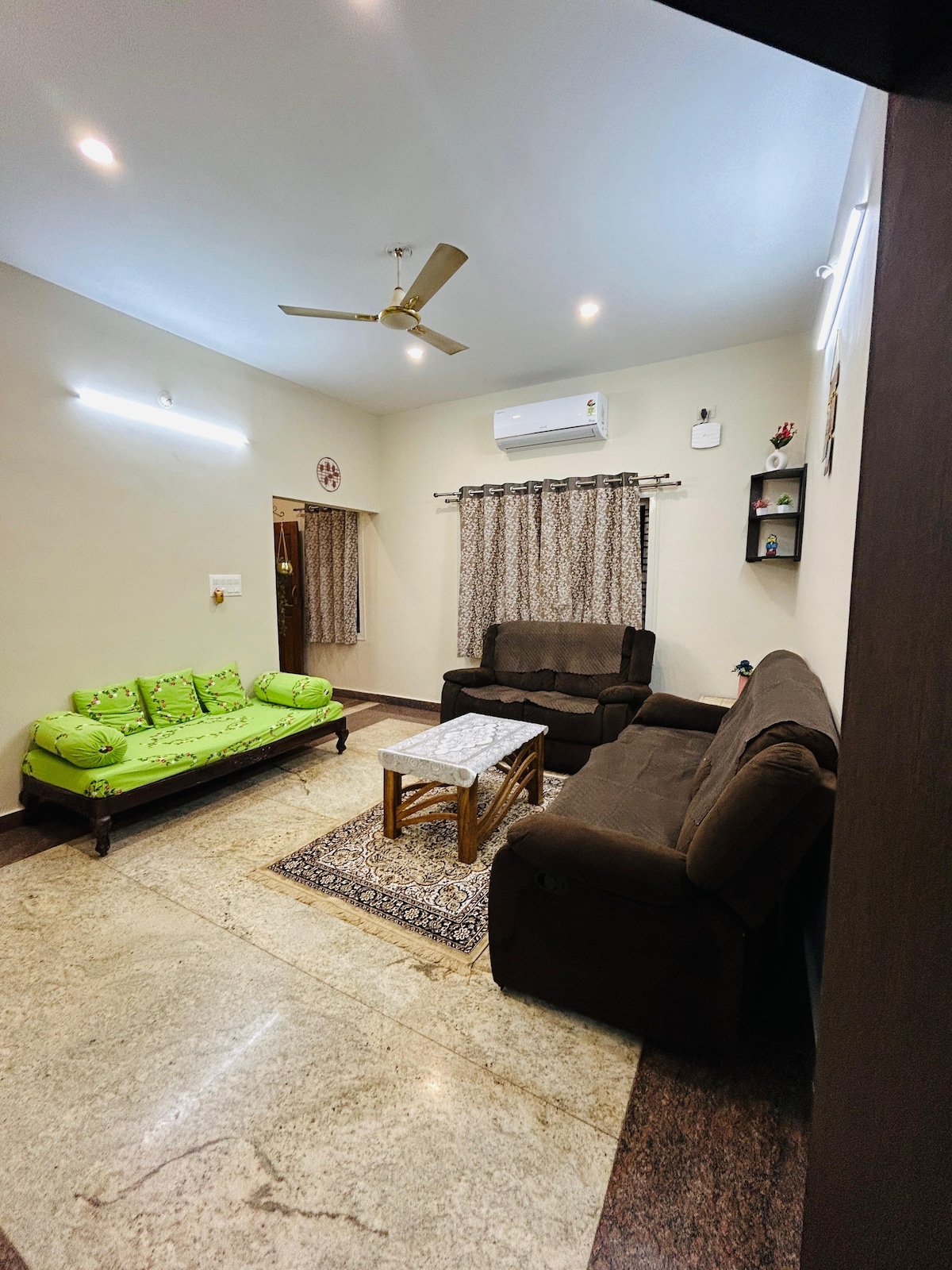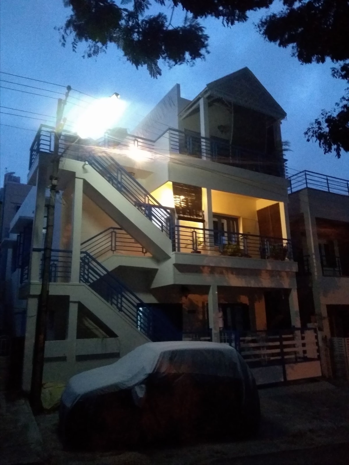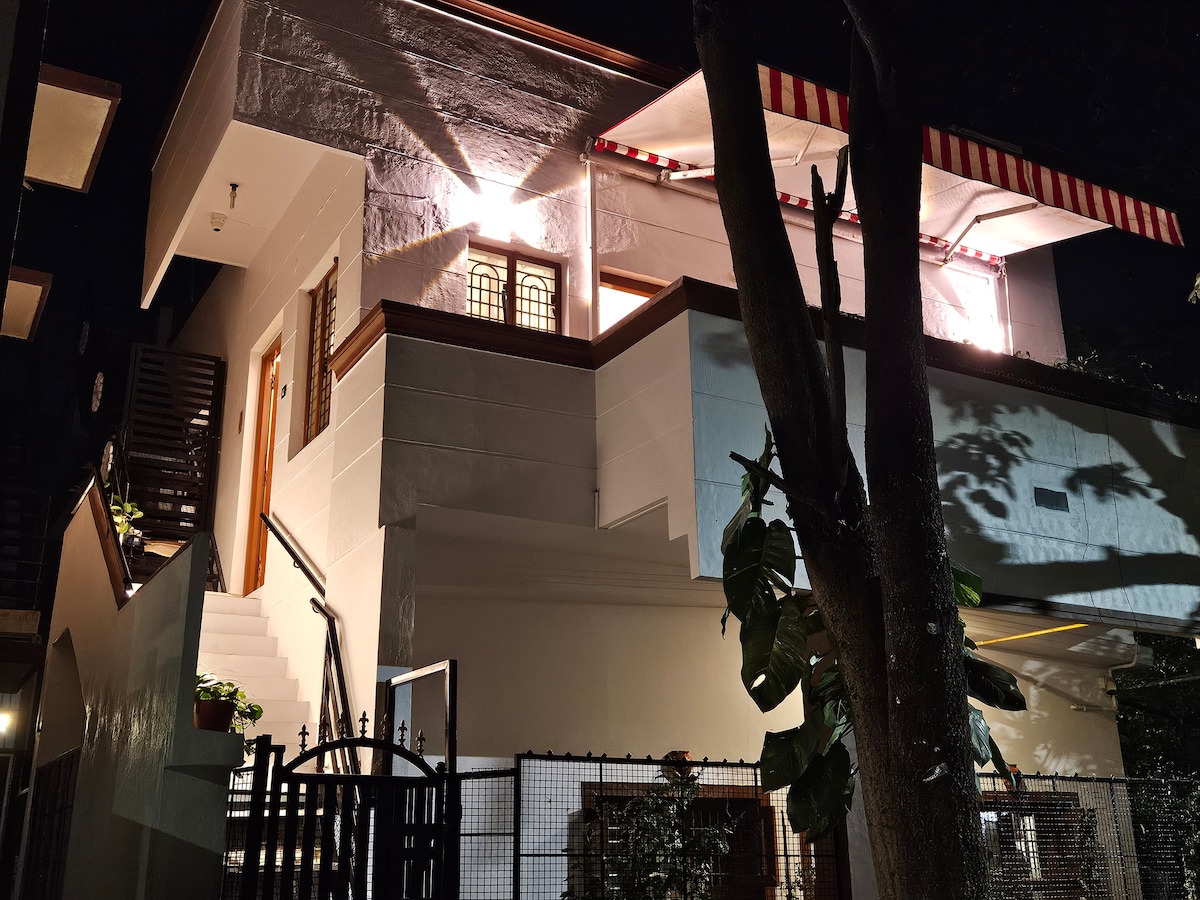 This spacious, clean and tastefully furnished first floor house offers a comfy and convenient base for seeing Mysore. It has a king size bed in bedroom with A/c and attached bathroom/toilet, dining room and kitchen, Living room has smart TV, sofa + a single bed and private roof terrace. WiFi speed is 100 mbps. Street car parking in front of our house is available.