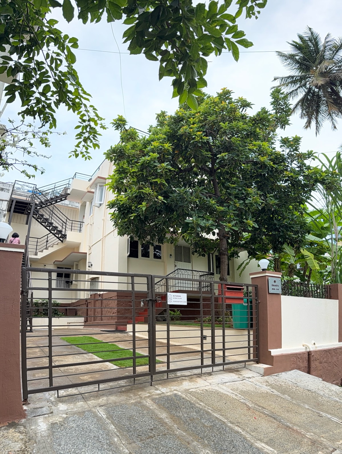 “Ananda Kutira” is a beautiful, newly built 1 bedroom, 1 bath first floor unit. Our guests describe it as "beautiful", "comfortable", "convenient", "neat" and "organized". It is located on a safe, quiet, clean locality. It is tastefully built with modern amenities: a hob, two ACs, dedicated work space, full mosquito netting, washer cum dryer and excellent Wifi. It is bright, breezy, quiet and private. There is also an enclosed terrace and a beautiful garden for you to enjoy!